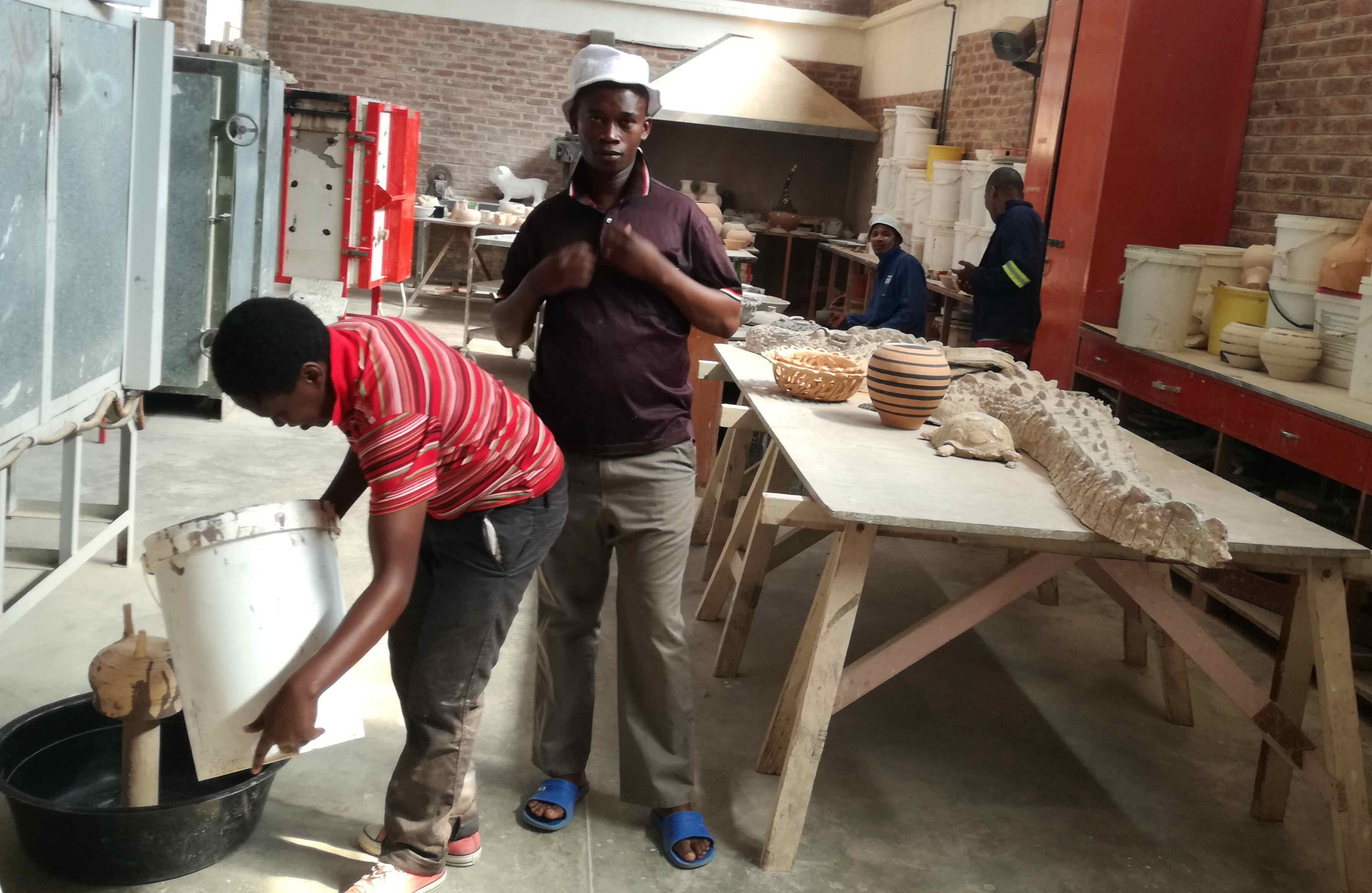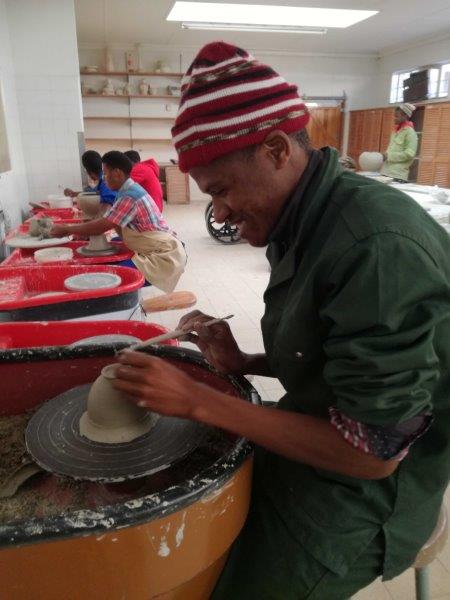 The young people, some 15 persons, receive a formal training programme utilizing basic skills development techniques at first which introduce them to pottery machinery, its use/ maintenance and various materials. They also receive through the training programme, certification by Walter Sisulu University of Technology.